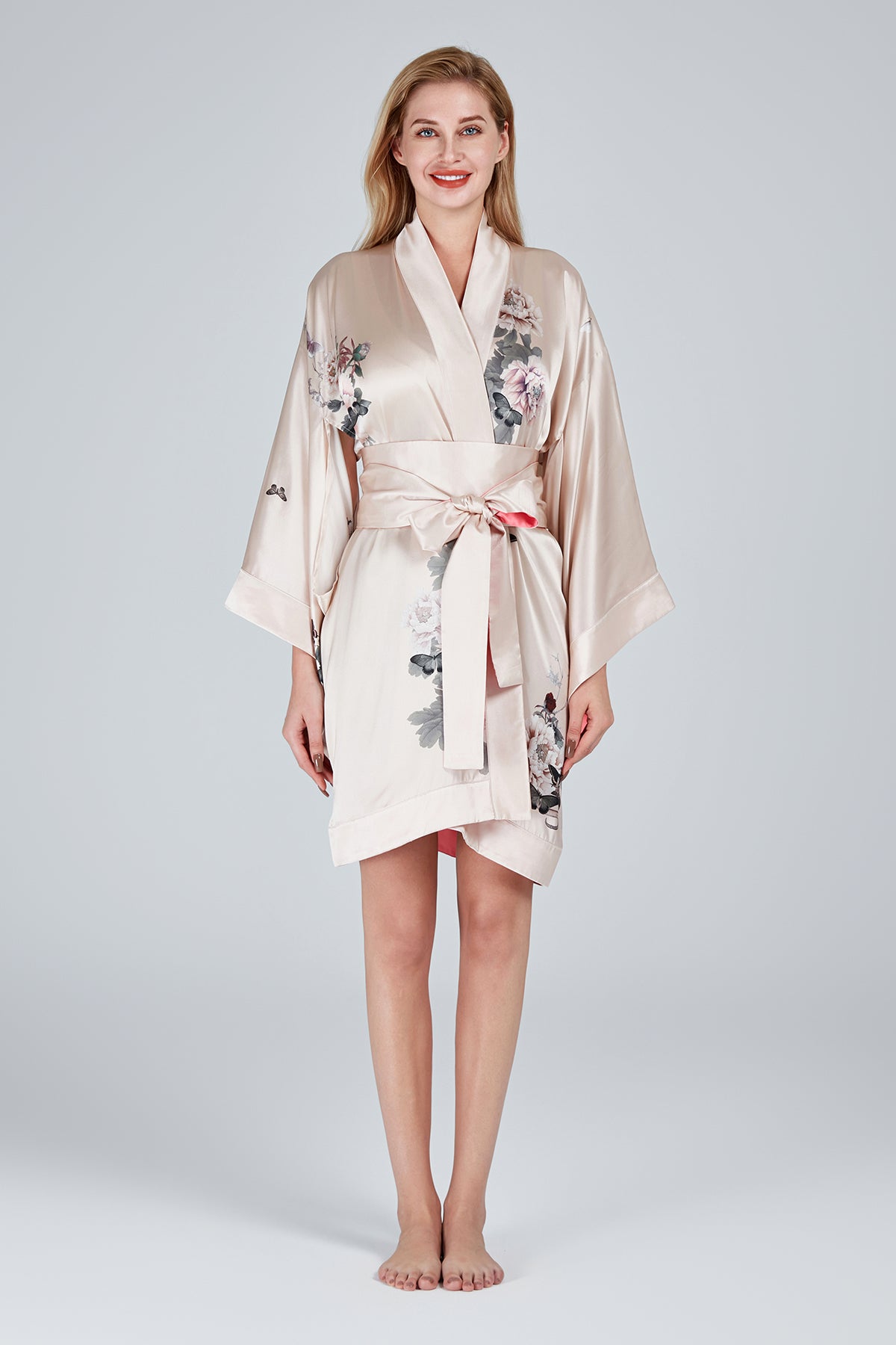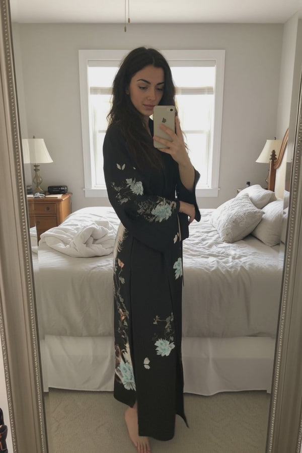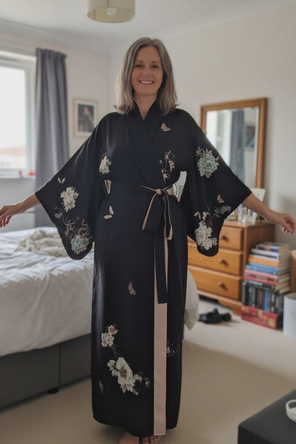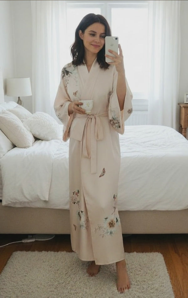 Slip into the delicate embrace of pure silk. Our silk satin kimono robe channels the serene beauty of Japanese artistry, offering a timeless silhouette crafted to make every moment feel extraordinary. Ideal for glamorous relaxation at home, holiday, honeymoon or bridal gift.