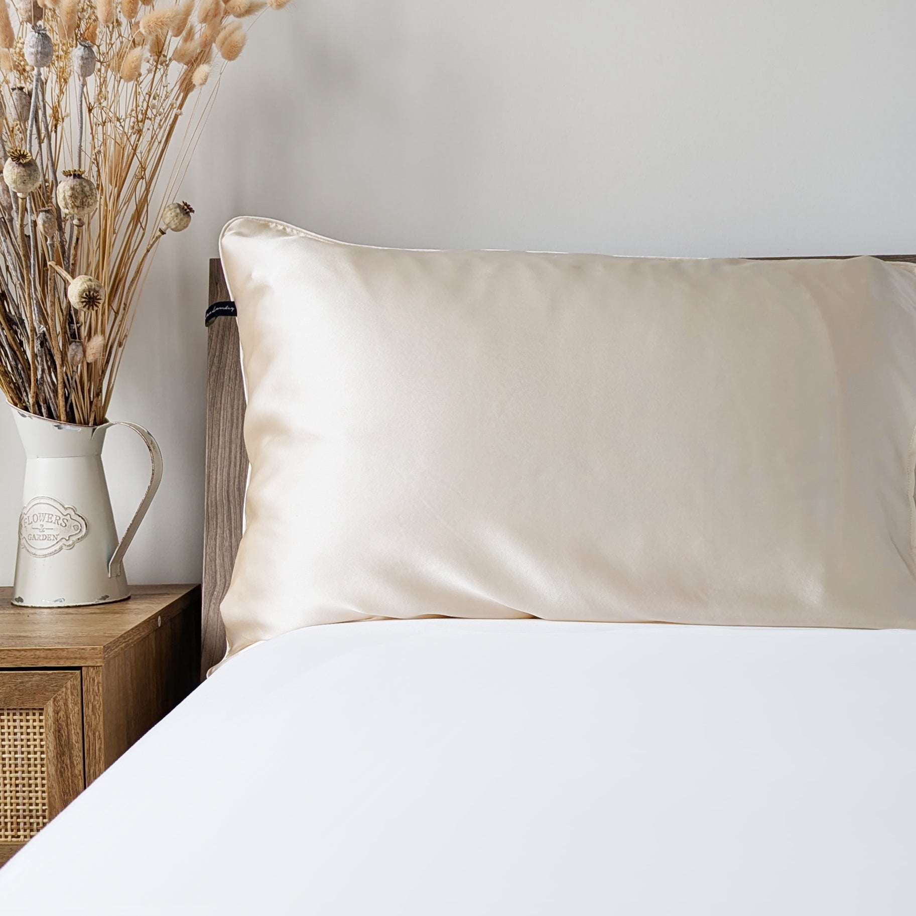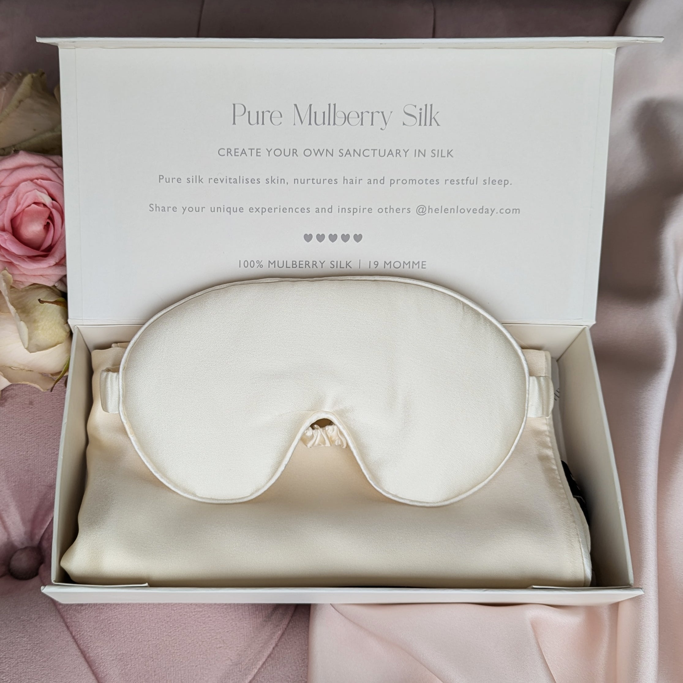 Indulge in ultimate luxury with our pure Mulberry cream silk pillowcase and eye mask gift set in a gift box.