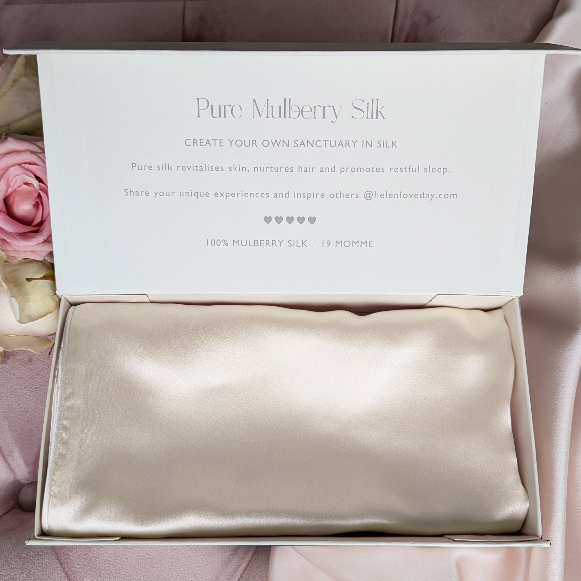 Indulge in ultimate luxury with our pure Mulberry cream silk pillowcase gift box.